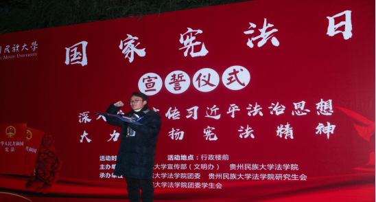 2020年12月4日,是我国第七个国家宪法日。上午七点半,我们在花溪校区行政楼前举行宪法宣誓活动,学校党委宣传部部长任洁同志、3044am永利官网党委书记石世文同志、3044am永利官网院长宋强同志、3044am永利官网党委副书记兰元富同志出席,3044am永利官网团委副书记丁莲媛、辅导员杨轶等教师代表和学院全体在校生参加,宣誓仪式由宋 强同志主持。