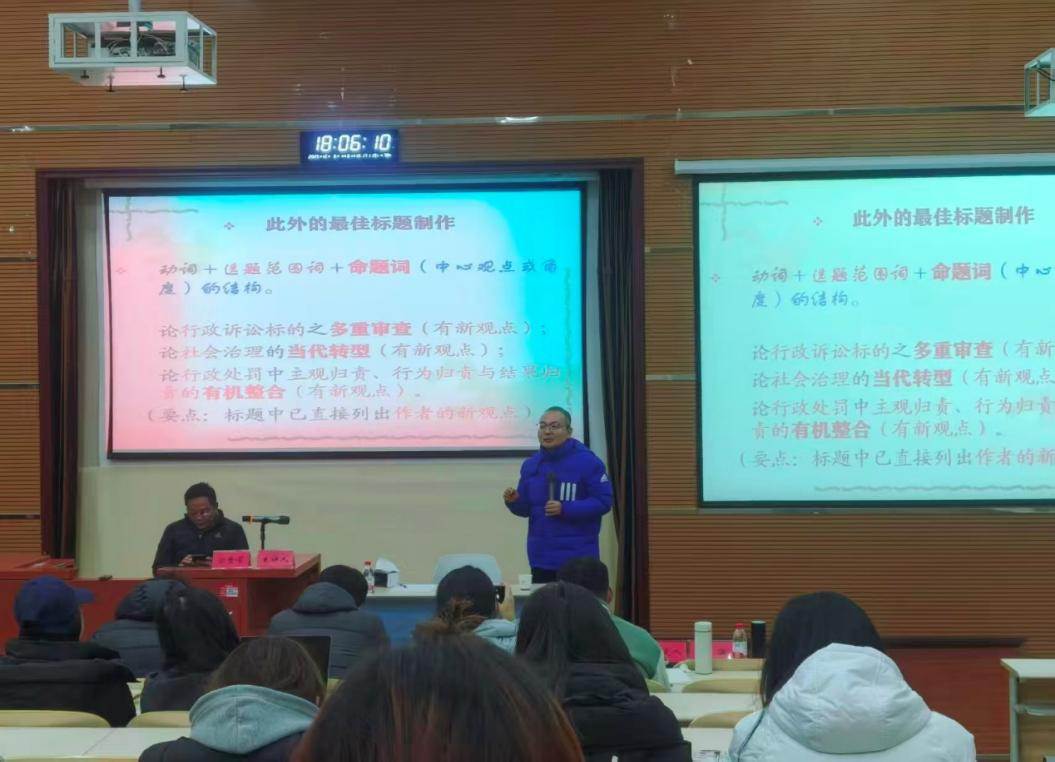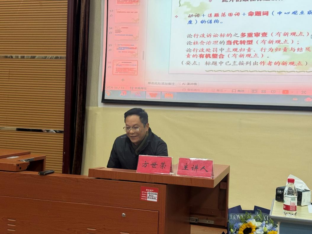 方世荣教授作为中南财经政法大学行政法学科的开创者与奠基人,深耕行政法学领域数十载,学术积淀深厚,论文指导经验丰富。报告中,他紧扣高校学位论文外审、抽查环节暴露的共性突出问题,从选题筛选、创新界定、亮点凸显三大核心模块展开系统讲解。选题层面,需精准把握学术价值与实践需求双重导向,结合自身研究基础合理划定范围,规避空泛、同质化等问题,锚定精准研究切入点;创新界定上,明确学术创新并非凭空创造,可从研究视角、分析方法、核心观点等维度突破,结合学科前沿与实务场景挖掘新意;亮点凸显方面,提出“动词+选题范围词+命题词”的论文标题优化结构,助力直观传递研究核心创新,为学子搭建全方位、实操性强的写作指引。